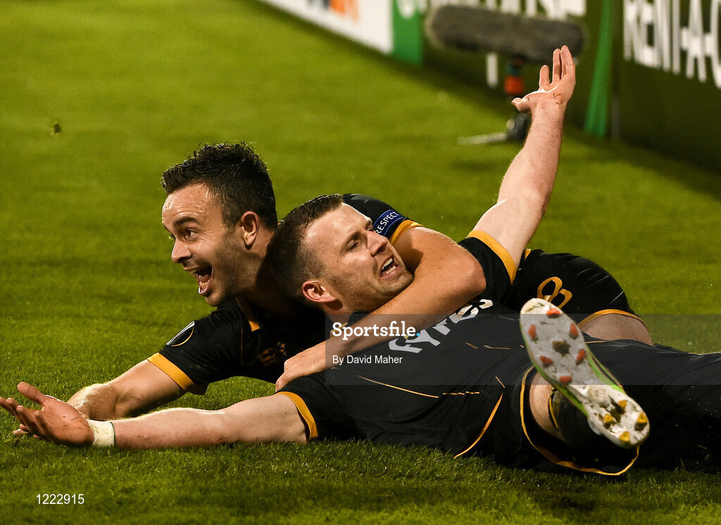 29 September 2016; Ciaran Kilduff, right, of Dundalk celebrates after scoring his side's first goal with team-mate Robbie Benson during the UEFA Europa League Group D match between Dundalk and Maccabi Tel Aviv at Tallaght Stadium in Tallaght, Co. Dublin. Photo by David Maher/Sportsfile