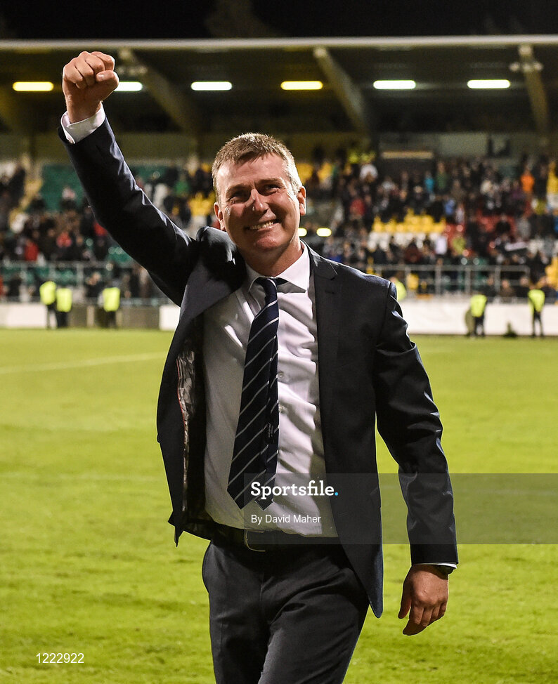 29 September 2016; Dundalk manager Stephen Kenny celebrates at the end of the UEFA Europa League Group D match between Dundalk and Maccabi Tel Aviv at Tallaght Stadium in Tallaght, Co. Dublin. Photo by David Maher/Sportsfile