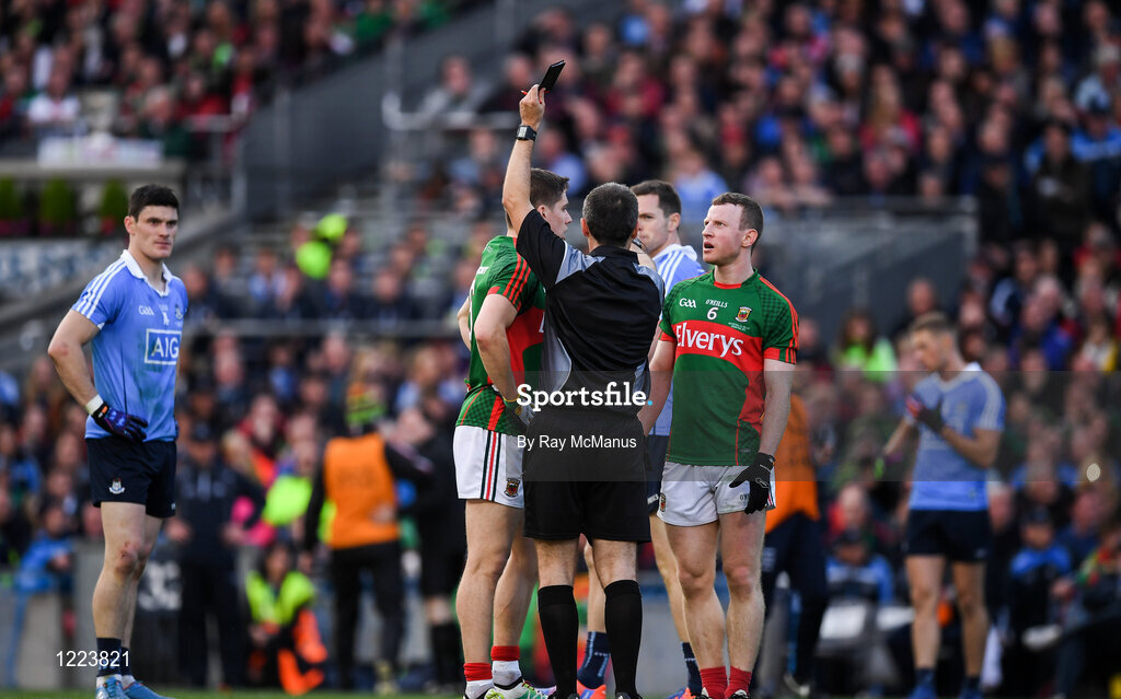 1 October 2016; Diarmuid Connolly of Dublin looks on as Referee Maurice Deegan shows a black card to Jonny Cooper of Dublin during the GAA Football All-Ireland Senior Championship Final Replay match between Dublin and Mayo at Croke Park in Dublin. Photo by Ray McManus/Sportsfile
