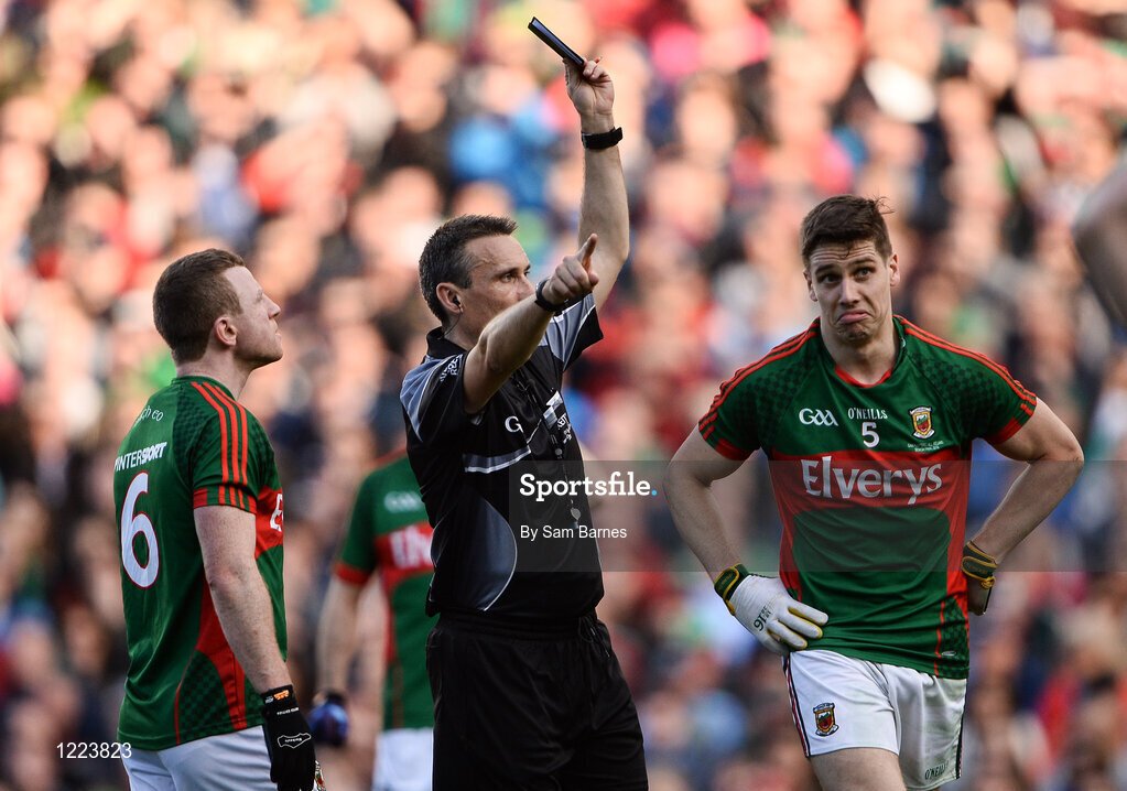 1 October 2016; Lee Keegan of Mayo, right, is shown a black card by referee Maurice Deegan during the GAA Football All-Ireland Senior Championship Final Replay match between Dublin and Mayo at Croke Park in Dublin. Photo by Sam Barnes/Sportsfile