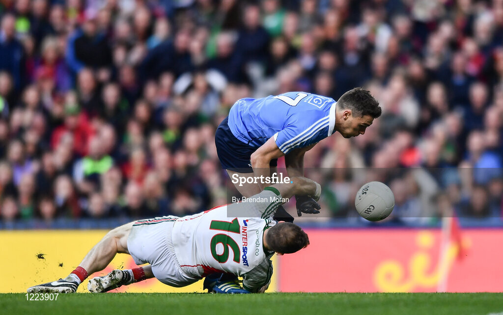1 October 2016; Paddy Andrews of Dublin is tackled by Robert Hennelly of Mayo, resulting in a penalty for Dublin, during the GAA Football All-Ireland Senior Championship Final Replay match between Dublin and Mayo at Croke Park in Dublin. Photo by Brendan Moran/Sportsfile