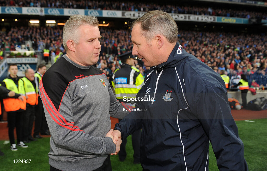1 October 2016; Mayo manager Stephen Rochford and Dublin manager Jim Gavin shake hands following the GAA Football All-Ireland Senior Championship Final Replay match between Dublin and Mayo at Croke Park in Dublin. Photo by Sam Barnes/Sportsfile