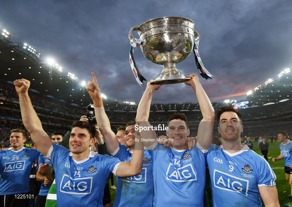 1 October 2016; Dublin players, from left, Bernard Brogan, Paddy Andrews, Diarmuid Connolly and Michael Darragh MacAuley celebrate with the Sam Maguire Cup following the GAA Football All-Ireland Senior Championship Final Replay match between Dublin and Mayo at Croke Park in Dublin. Photo by Stephen McCarthy/Sportsfile