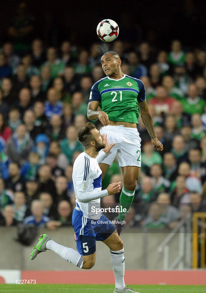 8 October 2016; Josh Magennis of Northern Ireland in action against Fabio Vitaiol of San Marino during the FIFA World Cup Group C Qualifier match between Northern Ireland and San Marino at Windsor Park in Belfast. Photo by Oliver McVeigh/Sportsfile