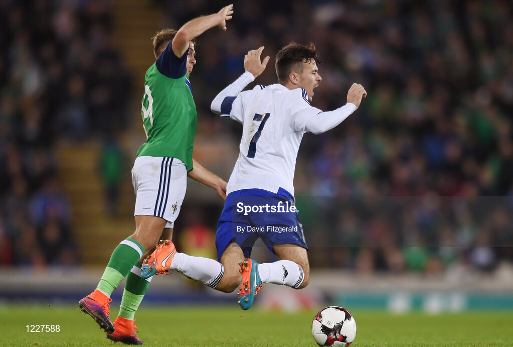 8 October 2016; Matteo Vitaloli of San Marino in action against Jamie Ward of Northern Ireland during the FIFA World Cup Group C Qualifier match between Northern Ireland and San Marino at Windsor Park in Belfast. Photo by David Fitzgerald/Sportsfile