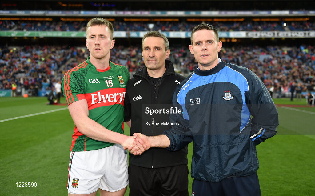 1 October 2016; Mayo captain Cillian O'Connor shakes hands with Dublin captain Stephen Cluxton in the presence of referee Maurice Deegan ahead of the GAA Football All-Ireland Senior Championship Final Replay match between Dublin and Mayo at Croke Park in Dublin. Photo by Ray McManus/Sportsfile