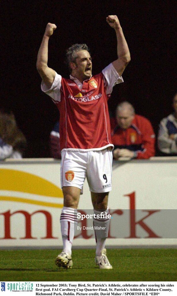 12 September 2003; Tony Bird, St. Patrick's Athletic, celebrates after scoring his sides first goal. FAI Carlsberg Cup Quarter-Final, St. Patrick's Athletic v Kildare County, Richmond Park, Dublin. Picture credit; David Maher / SPORTSFILE *EDI*