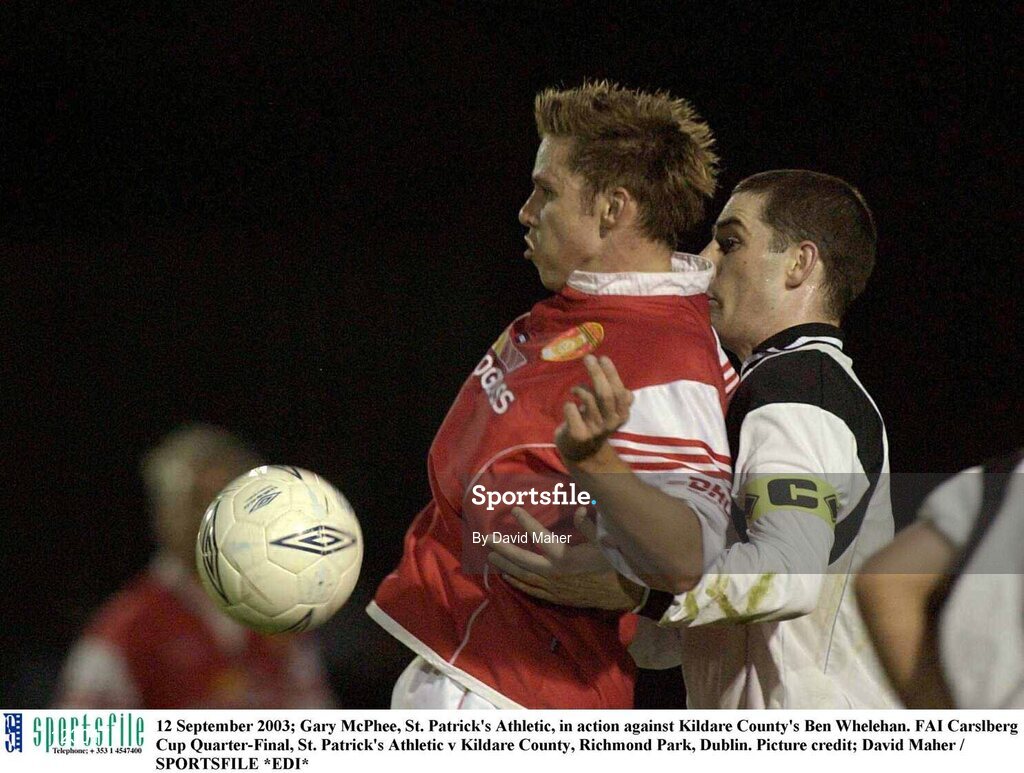12 September 2003; Gary McPhee, St. Patrick's Athletic, in action against Kildare County's Ben Whelehan. FAI Carlsberg Cup Quarter-Final, St. Patrick's Athletic v Kildare County, Richmond Park, Dublin. Picture credit; David Maher / SPORTSFILE *EDI*