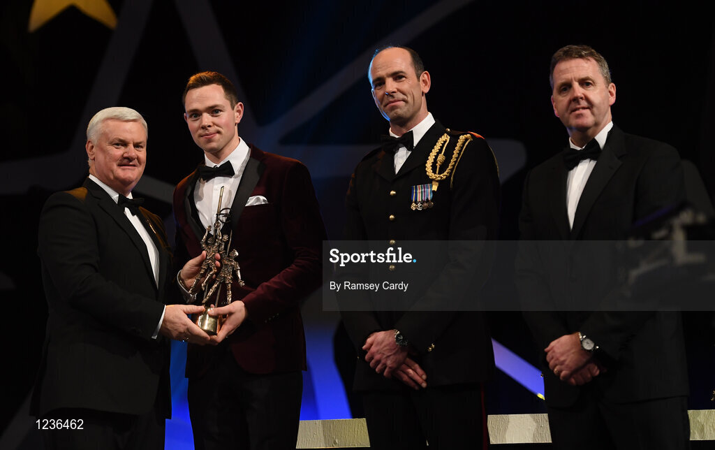 4 November 2016; Dublin Footballer Dean Rock receives his award from Uachtarán Chumann Lúthchleas Gael Aogán Ó Fearghail, in the company of Dermot Earley, 2nd from right, GPA President, and Dave Sheeran, right, Managing Director, Opel Ireland, at the 2016 GAA/GPA Opel All-Stars Awards at the Convention Centre in Dublin. Photo by Ramsey Cardy/Sportsfile