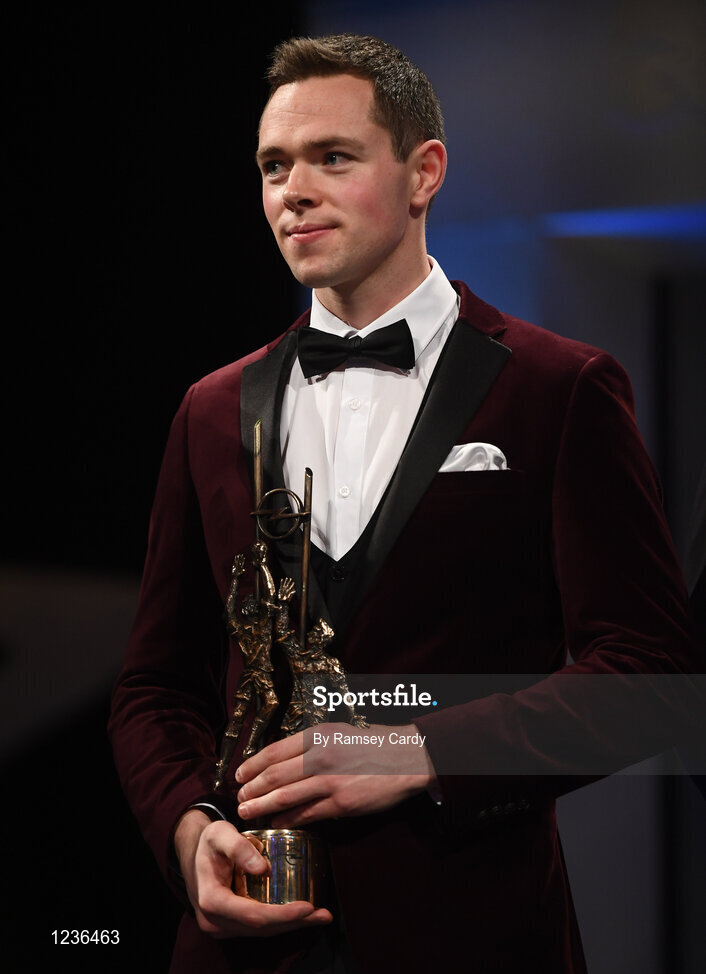 4 November 2016; Dublin Footballer Dean Rock with his award at the 2016 GAA/GPA Opel All-Stars Awards at the Convention Centre in Dublin. Photo by Ramsey Cardy/Sportsfile