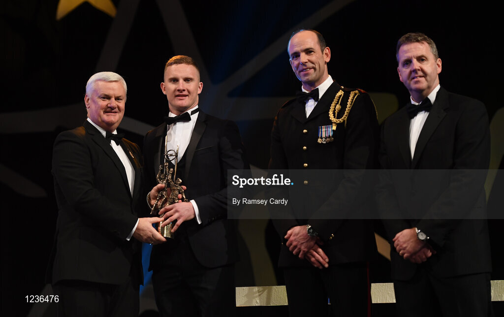 4 November 2016; Dublin footballer Ciarán Kilkenny receives his award from Uachtarán Chumann Lúthchleas Gael Aogán Ó Fearghail, in the company of Dermot Earley, 2nd from right, GPA President, and Dave Sheeran, right, Managing Director, Opel Ireland, at the 2016 GAA/GPA Opel All-Stars Awards at the Convention Centre in Dublin. Photo by Ramsey Cardy/Sportsfile