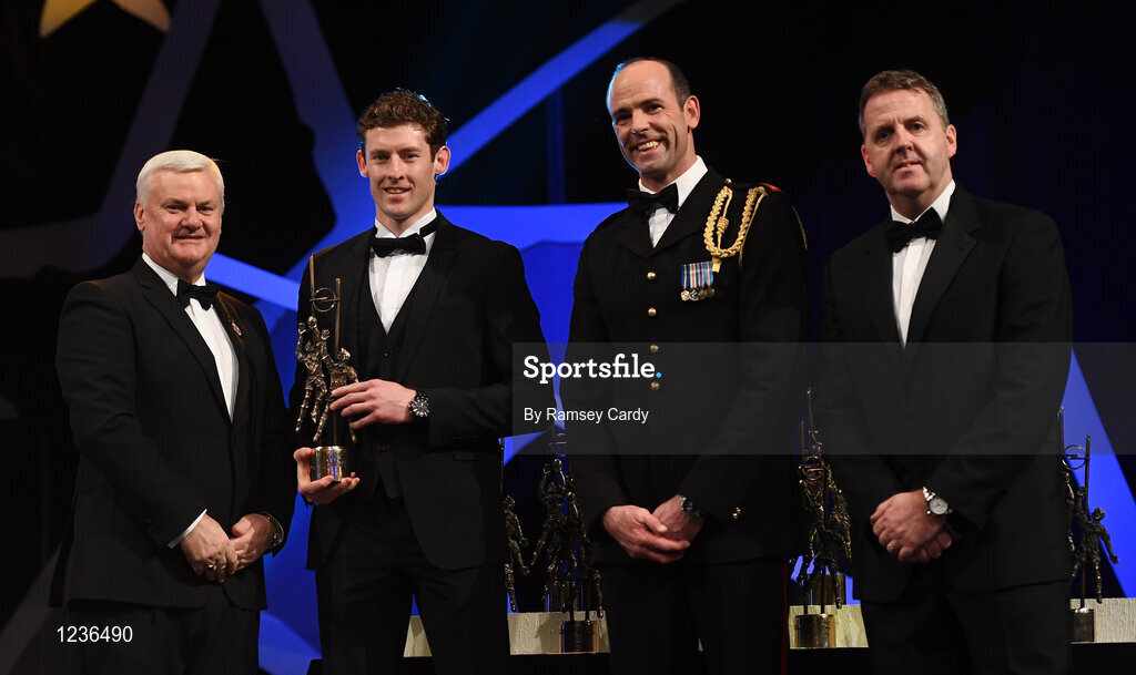4 November 2016; Mayo footballer David Clarke receives his award from Uachtarán Chumann Lúthchleas Gael Aogán Ó Fearghail, in the company of Dermot Earley, 2nd from right, GPA President, and Dave Sheeran, right, Managing Director, Opel Ireland, at the 2016 GAA/GPA Opel All-Stars Awards at the Convention Centre in Dublin. Photo by Ramsey Cardy/Sportsfile