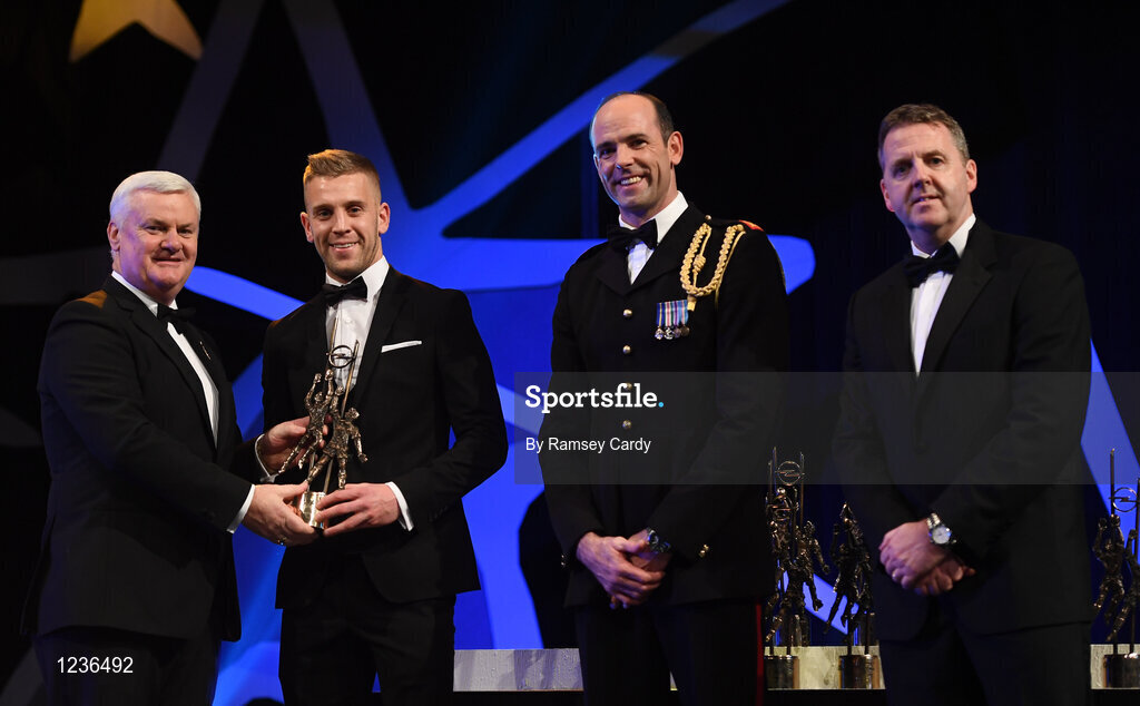 4 November 2016; Dublin footballer Jonny Cooper receives his award from Uachtarán Chumann Lúthchleas Gael Aogán Ó Fearghail, in the company of Dermot Earley, 2nd from right, GPA President, and Dave Sheeran, right, Managing Director, Opel Ireland, at the 2016 GAA/GPA Opel All-Stars Awards at the Convention Centre in Dublin. Photo by Ramsey Cardy/Sportsfile
