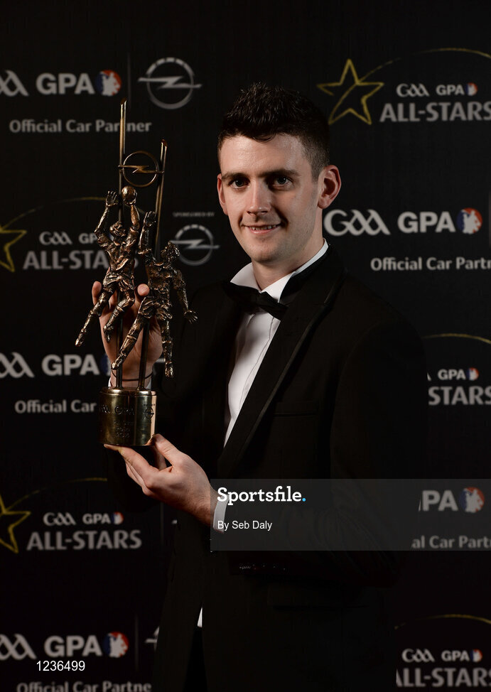 4 November 2016; Mayo footballer Brendan Harrison with his award at the 2016 GAA/GPA Opel All-Stars Awards at the Convention Centre in Dublin. Photo by Seb Daly/Sportsfile