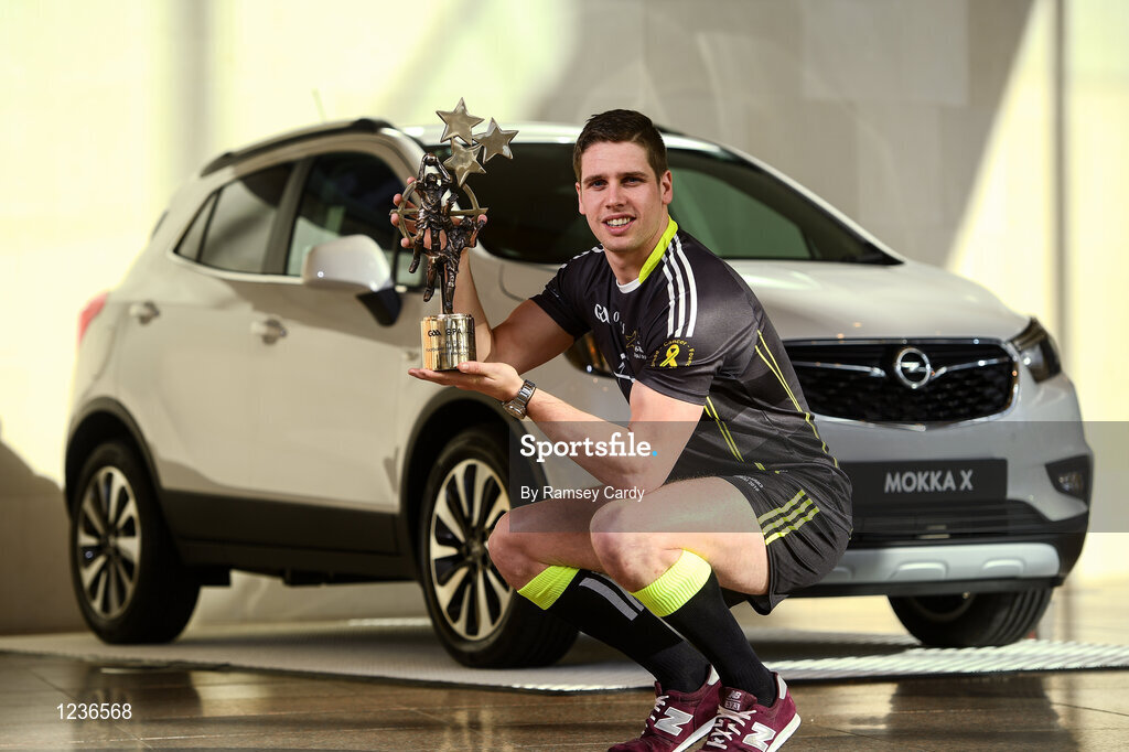 4 November 2016; Mayo footballer Lee Keegan receiving the award for GAA/GPA Opel All-Star Footballer of the Year 2016 at the Convention Centre in Dublin. Photo by Ramsey Cardy/Sportsfile