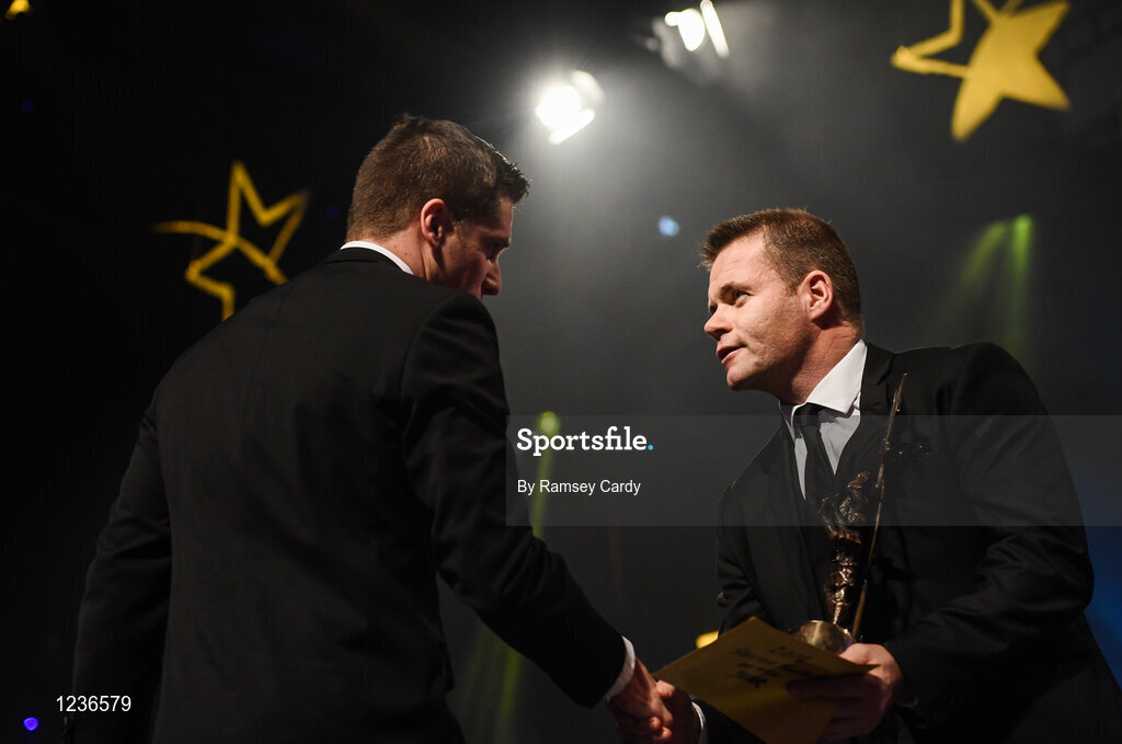 4 November 2016; Mayo footballer Lee Keegan is congratulated by Dessie Farrell after winning the Footballer of the Year award at the 2016 GAA/GPA Opel All-Stars Awards at the Convention Centre in Dublin. Photo by Ramsey Cardy/Sportsfile