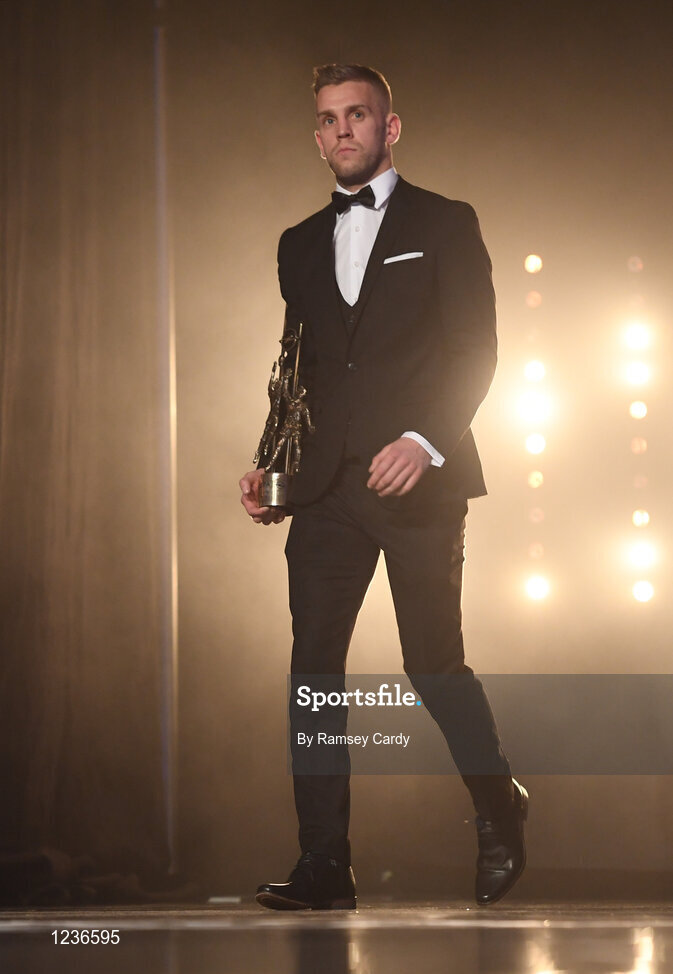 4 November 2016; Dublin footballer Jonny Cooper with his award at the 2016 GAA/GPA Opel All-Stars Awards at the Convention Centre in Dublin. Photo by Ramsey Cardy/Sportsfile