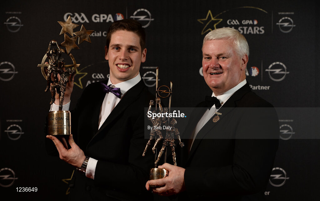 4 November 2016; Uachtarán Chumann Lúthchleas Gael Aogán Ó Fearghail and Mayo footballer Lee Keegan with his All-Star and Footballer of the Year Awards at the 2016 GAA/GPA Opel All-Stars Awards at the Convention Centre in Dublin. Photo by Seb Daly/Sportsfile