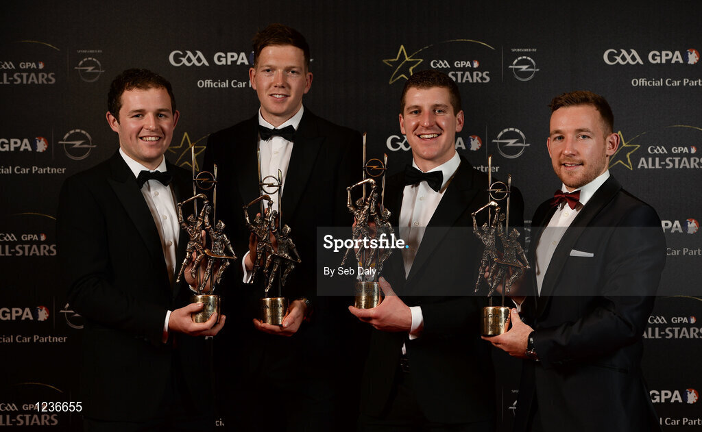 4 November 2016; Kilkenny hurlers, from left, Pádraig Walsh, Walter Walsh, Eóin Murphy and Richie Hogan with their awards at the 2016 GAA/GPA Opel All-Stars Awards at the Convention Centre in Dublin. Photo by Seb Daly/Sportsfile