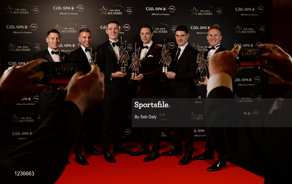 4 November 2016; Dublin footballers, from left, Philly McMahon, Jonny Cooper, Brian Fenton, Dean Rock, Diarmuid Connolly and Ciarán Kilkenny with their awards the 2016 GAA/GPA Opel All-Stars Awards at the Convention Centre in Dublin. Photo by Seb Daly/Sportsfile