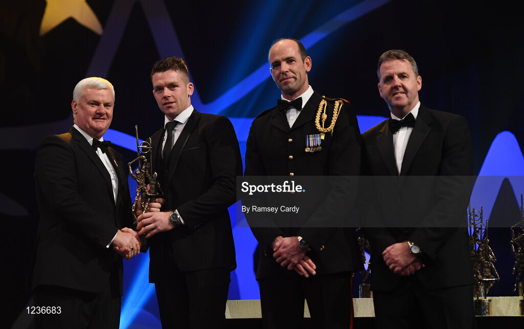 4 November 2016; Tipperary hurler Ronan Maher receives his award from Uachtarán Chumann Lúthchleas Gael Aogán Ó Fearghail, in the company of Dermot Earley, 2nd from right, GPA President, and Dave Sheeran, right, Managing Director, Opel Ireland, at the 2016 GAA/GPA Opel All-Stars Awards at the Convention Centre in Dublin. Photo by Ramsey Cardy/Sportsfile