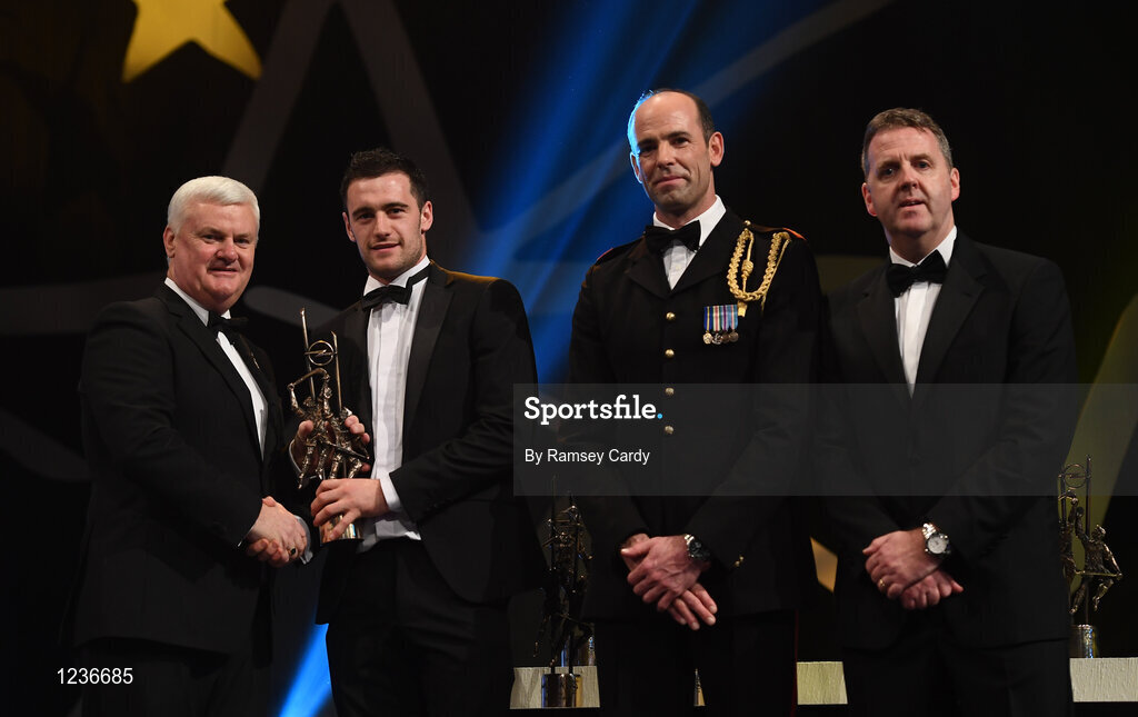 4 November 2016; Galway hurler David Burke receives his award from Uachtarán Chumann Lúthchleas Gael Aogán Ó Fearghail, in the company of Dermot Earley, 2nd from right, GPA President, and Dave Sheeran, right, Managing Director, Opel Ireland, at the 2016 GAA/GPA Opel All-Stars Awards at the Convention Centre in Dublin. Photo by Ramsey Cardy/Sportsfile