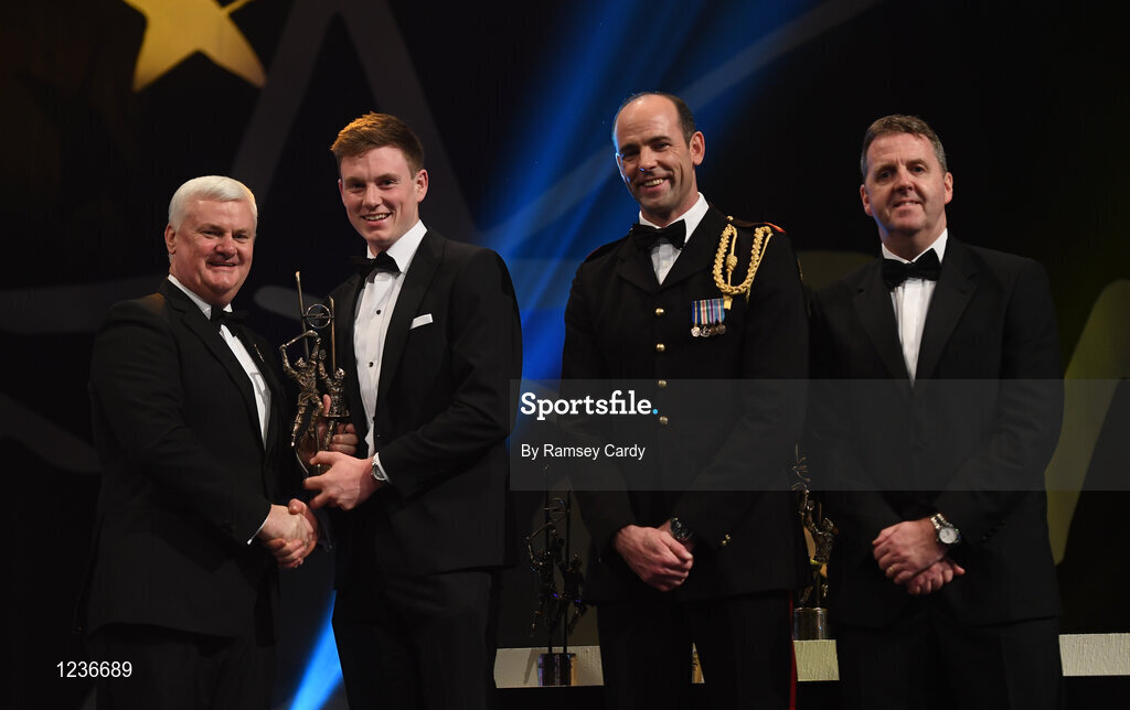 4 November 2016; Waterford hurler Austin Gleeson receives his award from Uachtarán Chumann Lúthchleas Gael Aogán Ó Fearghail, in the company of Dermot Earley, 2nd from right, GPA President, and Dave Sheeran, right, Managing Director, Opel Ireland, at the 2016 GAA/GPA Opel All-Stars Awards at the Convention Centre in Dublin. Photo by Ramsey Cardy/Sportsfile
