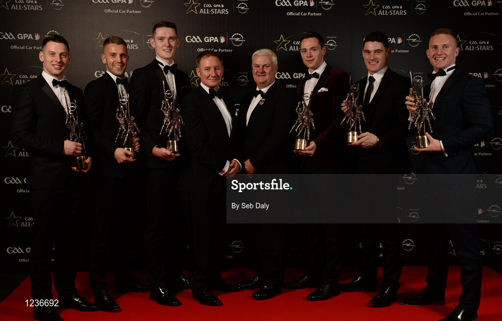 4 November 2016; Dublin footballers, from left, Philly McMahon, Jonny Cooper, Brian Fenton, Jim Gavin, Uachtarán Chumann Lúthchleas Gael Aogán Ó Fearghail, Dean Rock, Diarmuid Connolly and Ciarán Kilkenny with their awards the 2016 GAA/GPA Opel All-Stars Awards at the Convention Centre in Dublin. Photo by Seb Daly/Sportsfile