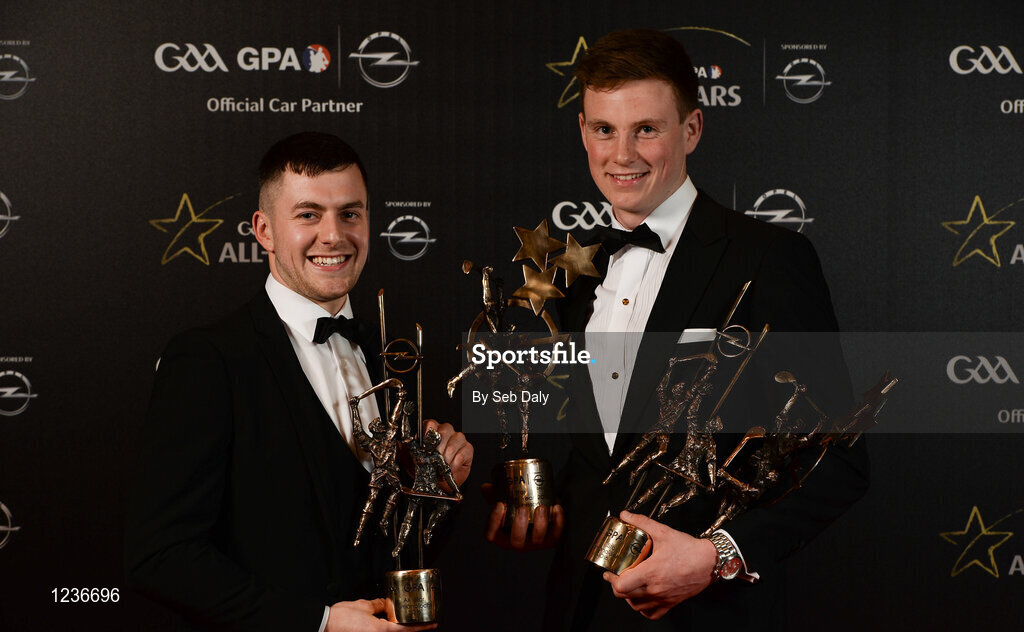 4 November 2016; Waterford hurlers Jamie Barron, left, with his All-Star Award and Austin Gleeson, with his All-Star, Young Hurler of the Year and Hurler of the Year awards at the 2016 GAA/GPA Opel All-Stars Awards at the Convention Centre in Dublin. Photo by Seb Daly/Sportsfile