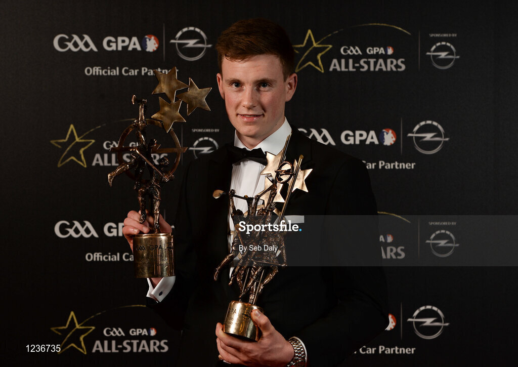 4 November 2016; Waterford hurler Austin Gleeson with his Hurler of the Year and Young Hurler of the year Awards at the 2016 GAA/GPA Opel All-Stars Awards at the Convention Centre in Dublin. Photo by Seb Daly/Sportsfile