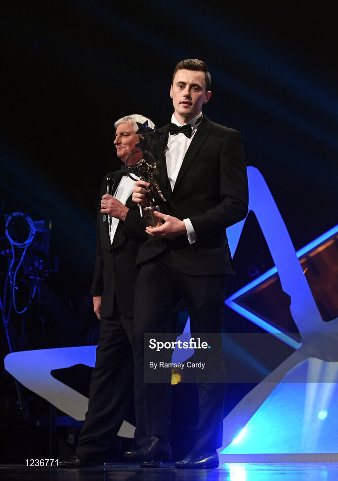 4 November 2016; Diarmuid O'Connor of Mayo after receiving his Young Footballer of the Year award at the 2016 GAA/GPA Opel All-Stars Awards at the Convention Centre in Dublin. Photo by Ramsey Cardy/Sportsfile