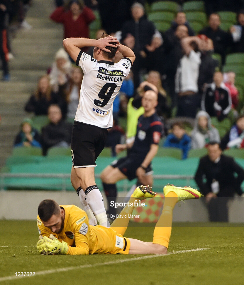 6 November 2016; David McMillan of Dundalk reacts after his shot was saved by Cork City goalkeeper Mark McNulty during the Irish Daily Mail FAI Cup Final match between Cork City and Dundalk at Aviva Stadium in Lansdowne Road, Dublin. Photo by David Maher/Sportsfile