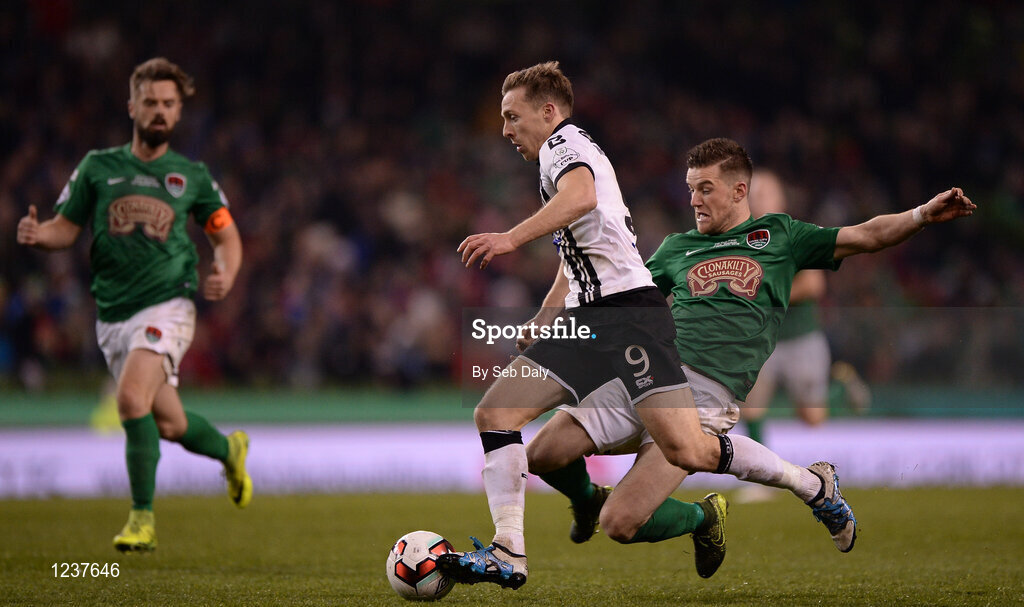 6 November 2016; David McMillan of Dundalk is tackled by Steven Beattie of Cork City during the Irish Daily Mail FAI Cup Final match between Cork City and Dundalk at Aviva Stadium in Lansdowne Road, Dublin. Photo by Seb Daly/Sportsfile