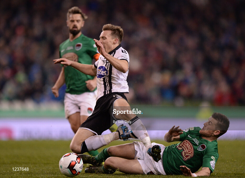 6 November 2016; David McMillan of Dundalk is tackled by Steven Beattie of Cork City during the Irish Daily Mail FAI Cup Final match between Cork City and Dundalk at Aviva Stadium in Lansdowne Road, Dublin. Photo by Seb Daly/Sportsfile