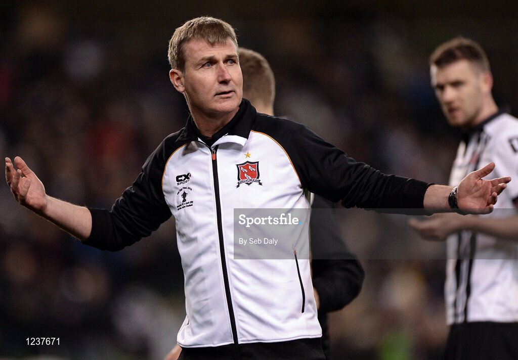 6 November 2016; Dundalk manager Stephen Kenny looks for encouragement from the supporters during the Irish Daily Mail FAI Cup Final match between Cork City and Dundalk at Aviva Stadium in Lansdowne Road, Dublin. Photo by Seb Daly/Sportsfile