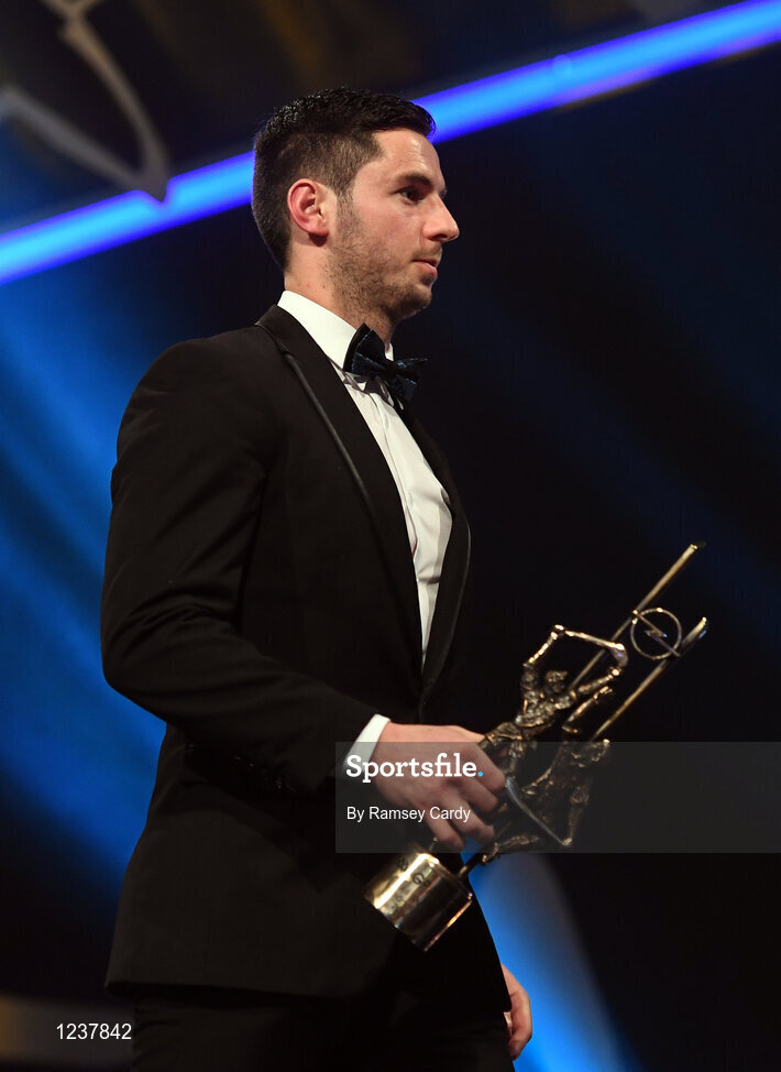 4 November 2016; Tipperary hurler Cathal Barrett with his award at the 2016 GAA/GPA Opel All-Stars Awards at the Convention Centre in Dublin. Photo by Ramsey Cardy/Sportsfile