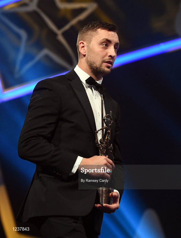 4 November 2016; Tipperary hurler James Barry with his award at the 2016 GAA/GPA Opel All-Stars Awards at the Convention Centre in Dublin. Photo by Ramsey Cardy/Sportsfile