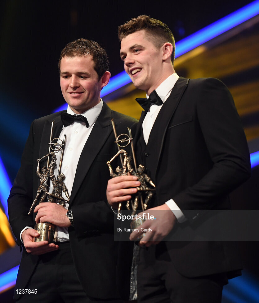 4 November 2016; Kilkenny hurler Padráig Walsh, left, and Tipperary hurler Ronan Maher with their awards at the 2016 GAA/GPA Opel All-Stars Awards at the Convention Centre in Dublin. Photo by Ramsey Cardy/Sportsfile