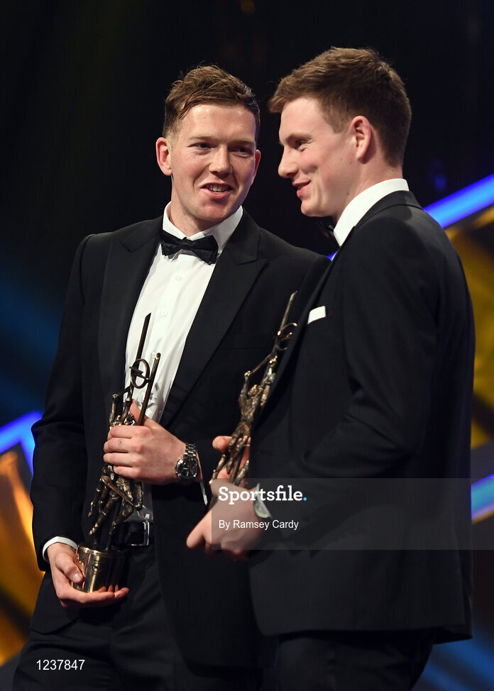 4 November 2016; Kilkenny hurler Walter Walsh, left, and Waterford hurler Austin Gleeson with their awards at the 2016 GAA/GPA Opel All-Stars Awards at the Convention Centre in Dublin. Photo by Ramsey Cardy/Sportsfile