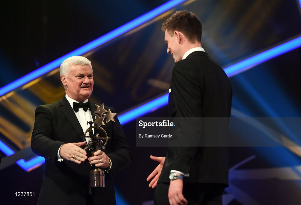 4 November 2016; Uachtarán Chumann Lúthchleas Gael Aogán Ó Fearghail presents Waterford's Austin Gleeson with the Young Hurler of the Year award at the 2016 GAA/GPA Opel All-Stars Awards at the Convention Centre in Dublin. Photo by Ramsey Cardy/Sportsfile
