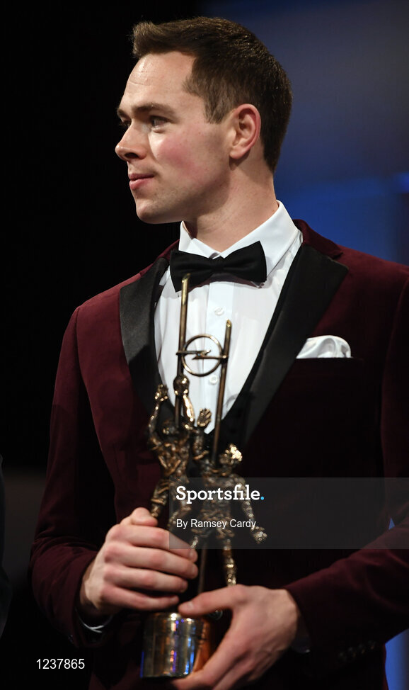4 November 2016; Dublin footballer Dean Rock with his award at the 2016 GAA/GPA Opel All-Stars Awards at the Convention Centre in Dublin. Photo by Ramsey Cardy/Sportsfile