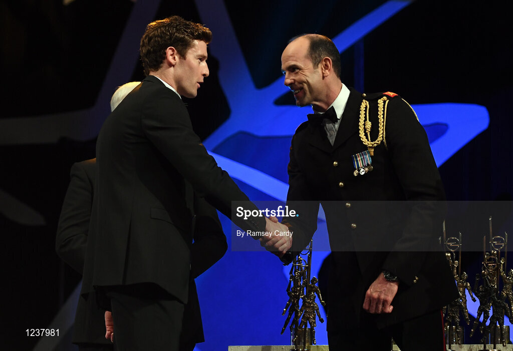 4 November 2016; Mayo footballer David Clarke is congratulated by GPA President Dermot Earley at the 2016 GAA/GPA Opel All-Stars Awards at the Convention Centre in Dublin. Photo by Ramsey Cardy/Sportsfile