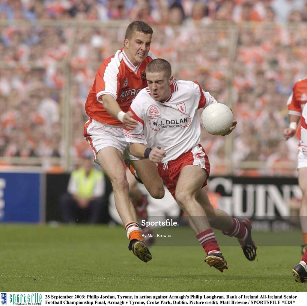 28 September 2003; Philip Jordan, Tyrone, in action against Armagh's Philip Loughran. Bank of Ireland All-Ireland Senior Football Championship Final, Armagh v Tyrone, Croke Park, Dublin. Picture credit; Matt Browne / SPORTSFILE *EDI*