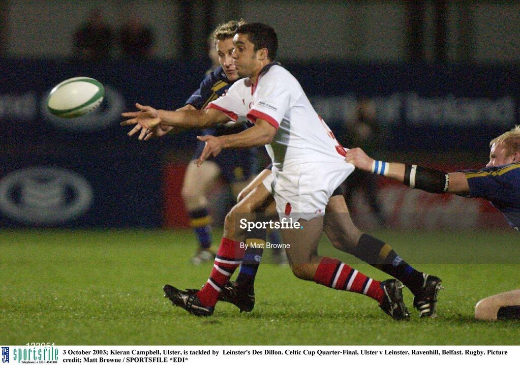 3 October 2003; Kieran Campbell, Ulster, is tackled by Leinster's Des Dillon. Celtic Cup Quarter-Final, Ulster v Leinster, Ravenhill, Belfast. Rugby. Picture credit; Matt Browne / SPORTSFILE *EDI*