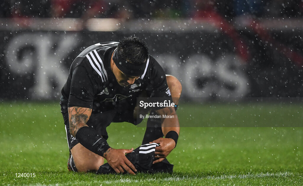 11 November 2016; Maori All Blacks captain Ash Dixon placing a jersey in honour of the late Munster head coach Anthony Foley on the pitch ahead of the match between Munster and the New Zealand Maori All Blacks at Thomond Park in Limerick. Photo by Brendan Moran/Sportsfile