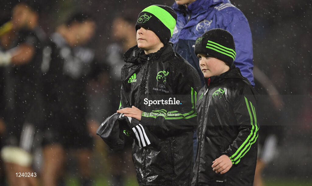 11 November 2016; Tony and Dan Foley leave the pitch after being presented with a jersey by the Maori All Black captain Ash Dixon in memory of their late father, the Munster head coach Anthony Foley, before the match between Munster and the New Zealand Maori All Blacks at Thomond Park in Limerick. Photo by Brendan Moran/Sportsfile