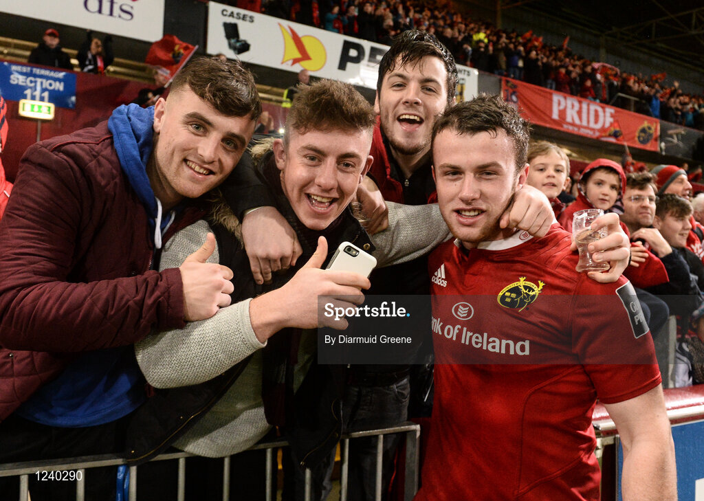 11 November 2016; John Foley of Munster celebrates with supporters after the match between Munster and the New Zealand Maori All Blacks at Thomond Park in Limerick. Photo by Diarmuid Greene/Sportsfile