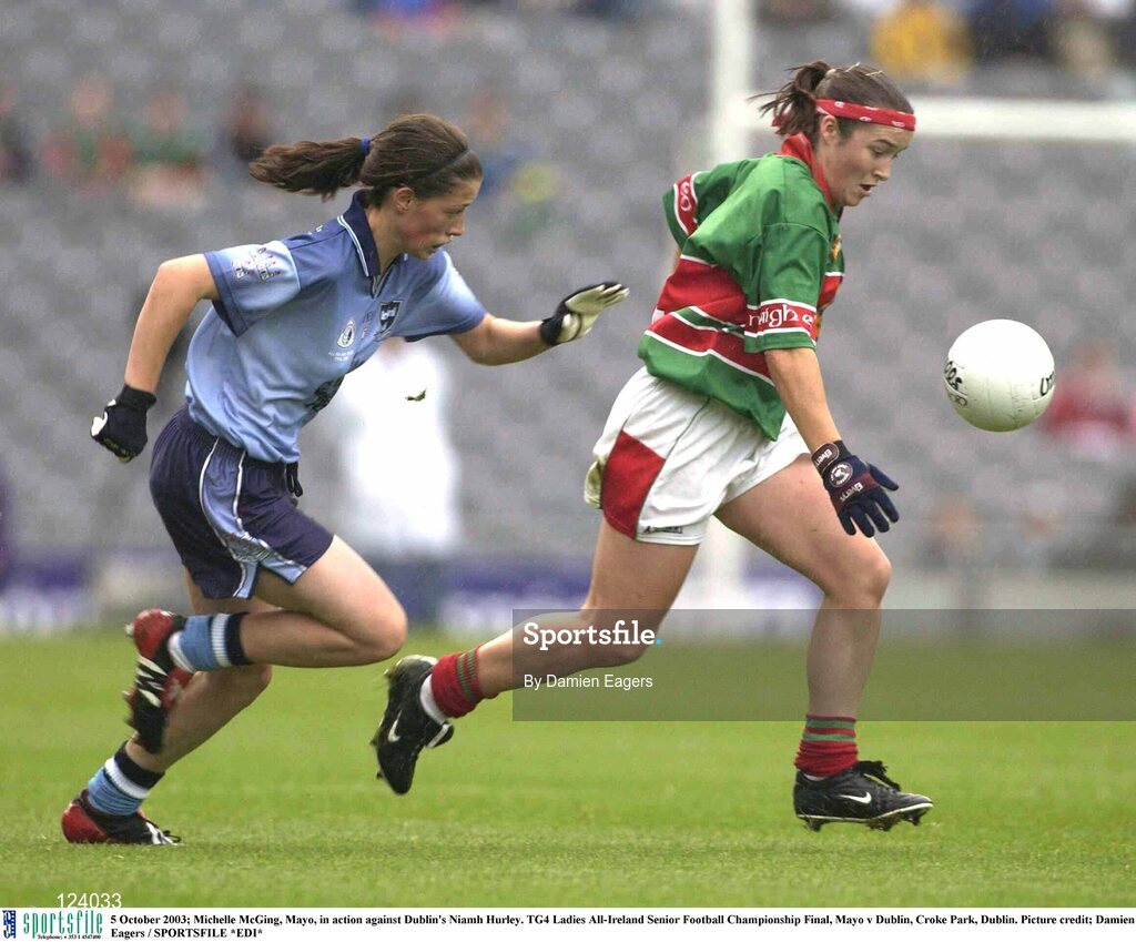 5 October 2003; Michelle McGing, Mayo, in action against Dublin's Niamh Hurley. TG4 Ladies All-Ireland Senior Football Championship Final, Mayo v Dublin, Croke Park, Dublin. Picture credit; Damien Eagers / SPORTSFILE *EDI*