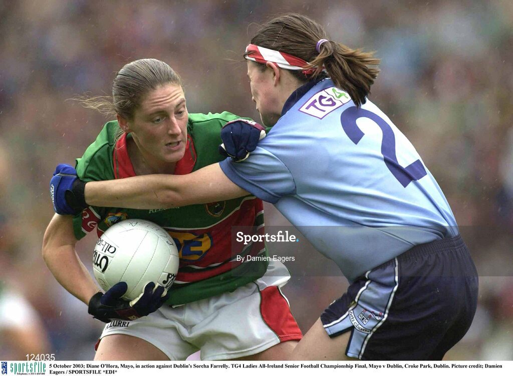 5 October 2003; Diane O'Hora, Mayo, in action against Dublin's Sorcha Farrelly. TG4 Ladies All-Ireland Senior Football Championship Final, Mayo v Dublin, Croke Park, Dublin. Picture credit; Damien Eagers / SPORTSFILE *EDI*