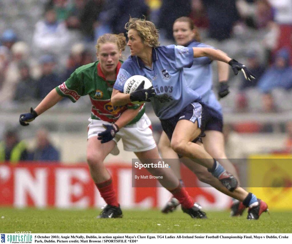 5 October 2003; Angie McNally, Dublin, in action against Mayo's Clare Egan. TG4 Ladies All-Ireland Senior Football Championship Final, Mayo v Dublin, Croke Park, Dublin. Picture credit; Matt Browne / SPORTSFILE *EDI*